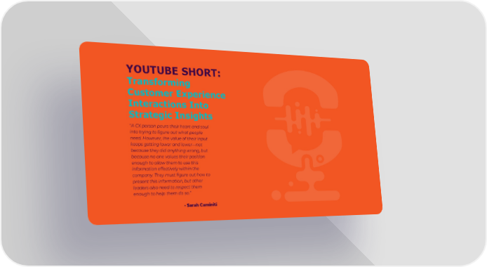 YOUTUBE SHORT: Transforming Customer Experience Interactions Into Strategic Insights “A CX person pours their heart and soul into trying to figure out what people need. However, the value of their input keeps getting lower and lower—not because they did anything wrong, but because no one values their position enough to allow them to use this information effectively within the company. They must figure out how to present this information, but other leaders also need to respect them enough to help them do so.” - Sarah Caminiti