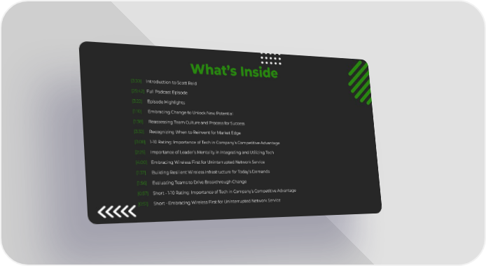What’s Inside [3:30] Introduction to Scott Reid [25:42] Full Podcast Episode [3:22] Episode Highlights [1:10] Embracing Change to Unlock New Potential [1:38] Reassessing Team Culture and Process for Success [3:32] Recognizing When to Reinvent for Market Edge [3:08] 1-10 Rating: Importance of Tech in Company’s Competitive Advantage [2:25] Importance of Leader’s Mentality in Integrating and Utilizing Tech [4:00] Embracing Wireless First for Uninterrupted Network Service [1:37] Building Resilient Wireless Infrastructure for Today’s Demands [1:56] Evaluating Teams to Drive Breakthrough Change [0:57] Short - 1-10 Rating: Importance of Tech in Company’s Competitive Advantage [0:51] Short - Embracing Wireless First for Uninterrupted Network Service