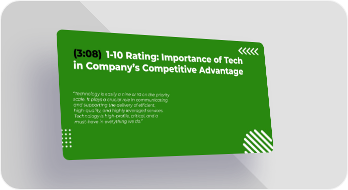 (3:08) 1-10 Rating: Importance of Tech in Company’s Competitive Advantage “Technology is easily a nine or 10 on the priority scale. It plays a crucial role in communicating and supporting the delivery of efficient, high-quality, and highly leveraged services. Technology is high-profile, critical, and a must-have in everything we do.”