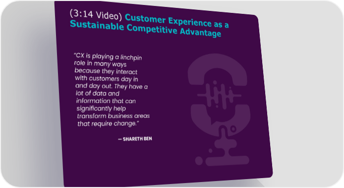 (3:14 Video) Customer Experience as a Sustainable Competitive Advantage “CX is playing a linchpin role in many ways because they interact with customers day in and day out. They have a lot of data and information that can significantly help transform business areas that require change.” — SHARETH BEN