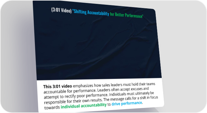 (3:01 Video) "Shifting Accountability for Better Performance" This 3:01 video emphasizes how sales leaders must hold their teams accountable for performance. Leaders often accept excuses and attempt to rectify poor performance. Individuals must ultimately be responsible for their own results. The message calls for a shift in focus towards individual accountability to drive performance.