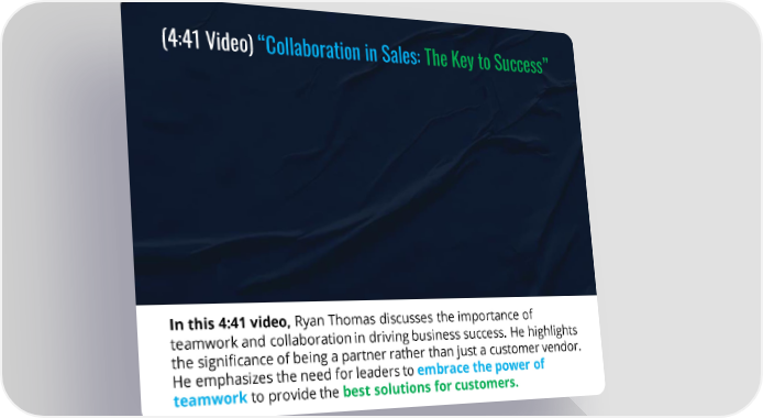 (4:41 Video) “Collaboration in Sales: The Key to Success” In this 4:41 video, Ryan Thomas discusses the importance of teamwork and collaboration in driving business success. He highlights the significance of being a partner rather than just a customer vendor. He emphasizes the need for leaders to embrace the power of teamworkto provide the best solutions for customers.