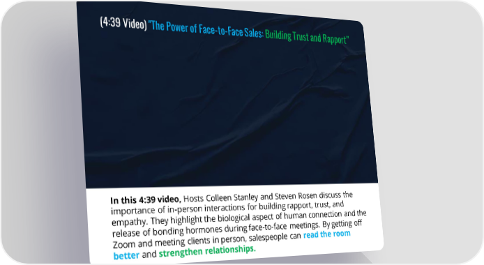 (4:39 Video) "The Power of Face-to-Face Sales: Building Trust and Rapport” In this 4:39 video, Hosts Colleen Stanley and Steven Rosen discuss the importance of in-person interactions for building rapport, trust, and empathy. They highlight the biological aspect of human connection and the release of bonding hormones during face-to-face meetings. By getting off Zoom and meeting clients in person, salespeople can read the room better and strengthen relationships.