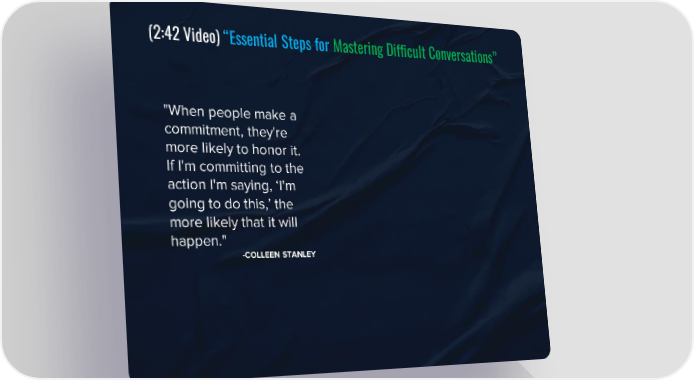 (2:42 Video) “Essential Steps for Mastering Difficult Conversations” "When people make a commitment, they're more likely to honor it. If I'm committing to the action I'm saying, ‘I'm going to do this,’ the more likely that it will happen." -COLLEEN STANLEY