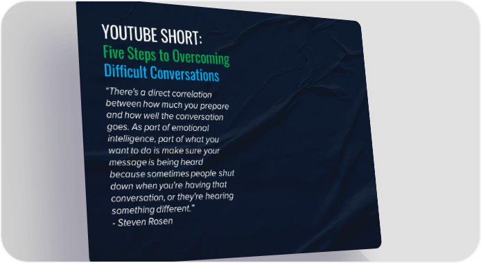 YOUTUBE SHORT: Five Steps to Overcoming Difficult Conversations “There's a direct correlation between how much you prepare and how well the conversation goes. As part of emotional intelligence, part of what you want to do is make sure your message is being heard because sometimes people shut down when you're having that conversation, or they're hearing something different.” - Steven Rosen