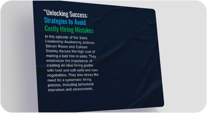 “Unlocking Success: Strategies to Avoid Costly Hiring Mistakes In this episode of the Sales Leadership Awakening podcast, Steven Rosen and Colleen Stanley discuss the high cost of making a bad hire in sales. They emphasize the importance of creating an ideal hiring profile with hard and soft skills and non- negotiables. They also stress the need for a systematic hiring process, including behavioral interviews and assessments.