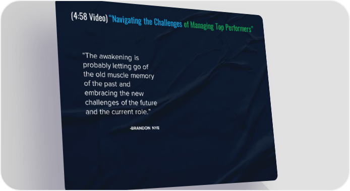 (4:58 Video) “Navigating the Challenges of Managing Top Performers” “The awakening is probably letting go of the old muscle memory of the past and embracing the new challenges of the future and the current role.” -BRANDON NYE