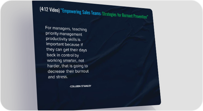 (4:12 Video) “Empowering Sales Teams: Strategies for Burnout Prevention” For managers, teaching priority management productivity skills is important because if they can get their days back in control by working smarter, not harder, that is going to decrease their burnout and stress. -COLLEEN STANLEY
