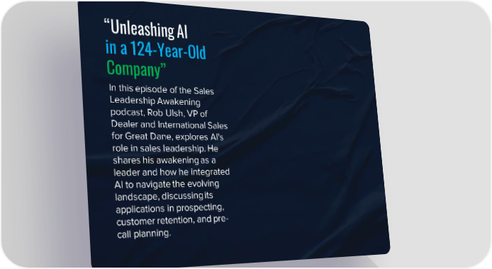 “Unleashing AI in a 124-Year-Old Company” In this episode of the Sales Leadership Awakening podcast, Rob Ulsh, VP of Dealer and International Sales for Great Dane, explores AI's role in sales leadership. He shares his awakening as a leader and how he integrated AI to navigate the evolving landscape, discussing its applications in prospecting, customer retention, and pre- call planning.