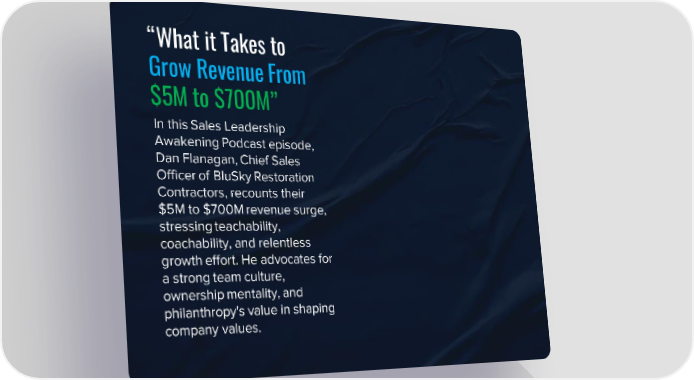 “What it Takes to Grow Revenue From $5M to $700M” In this Sales Leadership Awakening Podcast episode, Dan Flanagan, Chief Sales Officer of BluSkyRestoration Contractors, recounts their $5M to $700M revenue surge, stressing teachability, coachability, and relentless growth effort. He advocates for a strong team culture, ownership mentality, and philanthropy's value in shaping company values.
