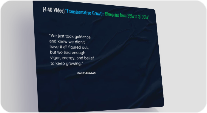 (4:40 Video) "Transformative Growth: Blueprint from $5M to $700M” “We just took guidance and knew we didn’t have it all figured out, but we had enough vigor, energy, and belief to keep growing.” -DAN FLANAGAN SLA Episode 19c - “What It Takes To Grow Revenues From 5M to $700M” Page 5 Page 7Summary Video ArticleVideo Player is loading.Play VideoPlaySkip BackwardSkip ForwardMuteCurrent Time 0:00/Duration 4:40Loaded: 0.00%0:00Stream Type LIVESeek to live, currently behind liveLIVERemaining Time -4:40 1xPlayback RateChaptersChaptersDescriptionsdescriptions off, selectedCaptionscaptions settings, opens captions settings dialogcaptions off, selectedAudio TrackPicture-in-PictureFullscreenThis is a modal window.Beginning of dialog window. Escape will cancel and close the window.TextColorWhiteBlackRedGreenBlueYellowMagentaCyanOpacityOpaqueSemi-TransparentText BackgroundColorBlackWhiteRedGreenBlueYellowMagentaCyanOpacityOpaqueSemi-TransparentTransparentCaption Area BackgroundColorBlackWhiteRedGreenBlueYellowMagentaCyanOpacityTransparentSemi-TransparentOpaqueFont Size50%75%100%125%150%175%200%300%400%Text Edge StyleNoneRaisedDepressedUniformDrop shadowFont FamilyProportional Sans-SerifMonospace Sans-SerifProportional SerifMonospace SerifCasualScriptSmall CapsResetDoneClose Modal DialogEnd of dialog window.salesleadershipdevelopment.comvideo