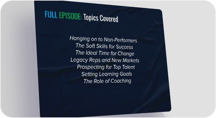FULL EPISODE: Topics Covered Hanging on to Non-Performers The Soft Skills for Success The Ideal Time for Change Legacy Reps and New Markets Prospecting for Top Talent Setting Learning Goals The Role of Coaching