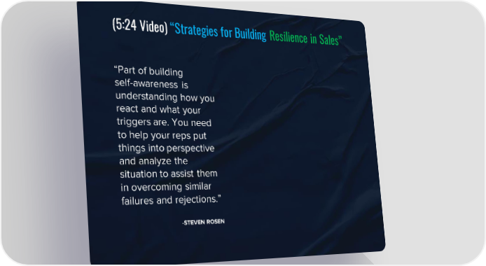 (5:24 Video) “Strategies for Building Resilience in Sales” “Part of building self-awareness is understanding how you react and what your triggers are. You need to help your reps put things into perspective and analyze the situation to assist them in overcoming similar failures and rejections.” -STEVEN ROSEN