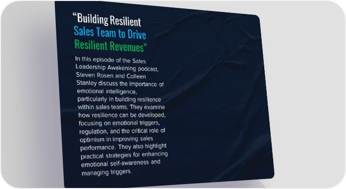 “Building Resilient Sales Team to Drive Resilient Revenues” In this episode of the Sales Leadership Awakening podcast, Steven Rosen and Colleen Stanley discuss the importance of emotional intelligence, particularly in building resilience within sales teams. They examine how resilience can be developed, focusing on emotional triggers, regulation, and the critical role of optimism in improving sales performance. They also highlight practical strategies for enhancing emotional self-awareness and managing triggers.