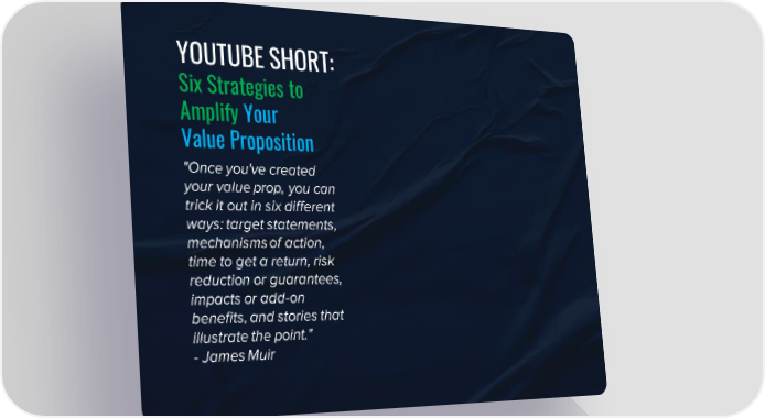 YOUTUBE SHORT: Six Strategies to Amplify Your Value Proposition "Once you've created your value prop, you can trick it out in six different ways: target statements, mechanisms of action, time to get a return, risk reduction or guarantees, impacts or add-on benefits, and stories that illustrate the point." - James Muir