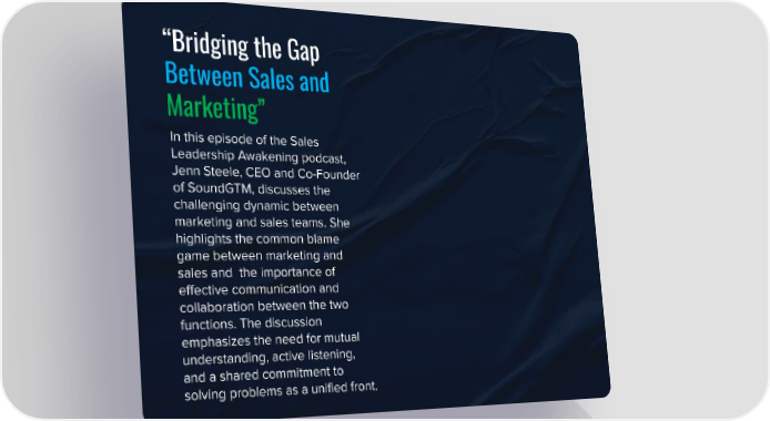 “Bridging the Gap Between Sales and Marketing” In this episode of the Sales Leadership Awakening podcast, Jenn Steele, CEO and Co-Founder of SoundGTM, discusses the challenging dynamic between marketing and sales teams. She highlights the common blame game between marketing and sales and the importance of effective communication and collaboration between the two functions. The discussion emphasizes the need for mutual understanding, active listening, and a shared commitment to solving problems as a unified front.