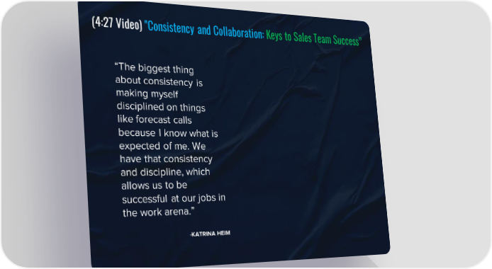 (4:27 Video) "Consistency and Collaboration: Keys to Sales Team Success” “The biggest thing about consistency is making myself disciplined on things like forecast calls because I know what is expected of me. We have that consistency and discipline, which allows us to be successful at our jobs in the work arena.” -KATRINA HEIM