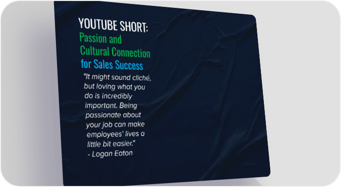 YOUTUBE SHORT: Passion and Cultural Connection for Sales Success "It might sound cliché, but loving what you do is incredibly important. Being passionate about your job can make employees' lives a little bit easier." - Logan Eaton