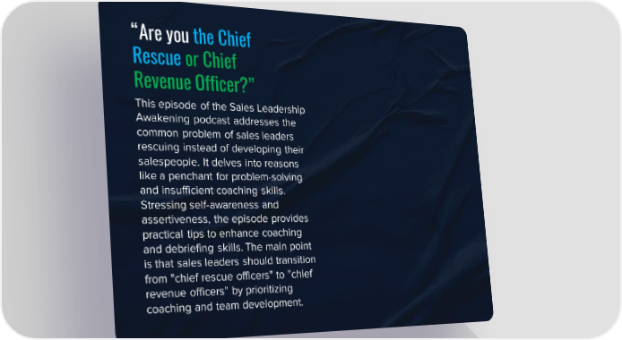 βAre you the Chief Rescue or Chief Revenue Officer?β This episode of the Sales Leadership Awakening podcast addresses the common problem of sales leaders rescuing instead of developing their salespeople. It delves into reasons like a penchant for problem-solving and insufficient coaching skills. Stressing self-awareness and assertiveness, the episode provides practical tips to enhance coaching and debriefing skills. The main point is that sales leaders should transition from "chief rescue officers" to "chief revenue officers" by prioritizing coaching and team development.
