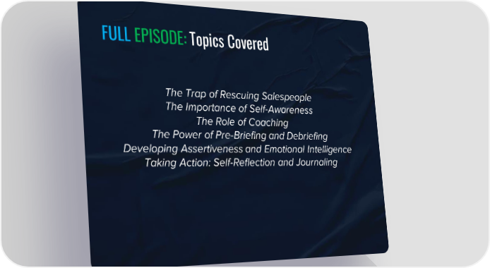 FULL EPISODE:Topics Covered The Trap of Rescuing Salespeople The Importance of Self-Awareness The Role of Coaching The Power of Pre-Briefing and Debriefing Developing Assertiveness and Emotional Intelligence Taking Action: Self-Reflection and Journaling