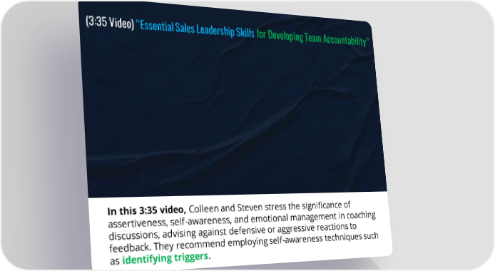 (3:35 Video) “Essential Sales Leadership Skills for Developing Team Accountability” In this 3:35 video, Colleen and Steven stress the significance of assertiveness, self-awareness, and emotional management in coaching discussions, advising against defensive or aggressive reactions to feedback. They recommend employing self-awareness techniques such as identifying triggers.