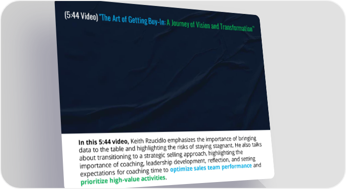 (5:44 Video) "The Art of Getting Buy-In: A Journey of Vision and Transformation” In this 5:44 video, Keith Rzucidlo emphasizes the importance of bringing data to the table and highlighting the risks of staying stagnant. He also talks about transitioning to a strategic selling approach, highlighting the importance of coaching, leadership development, reflection, and setting expectations for coaching time to optimize sales team performance and prioritize high-value activities.