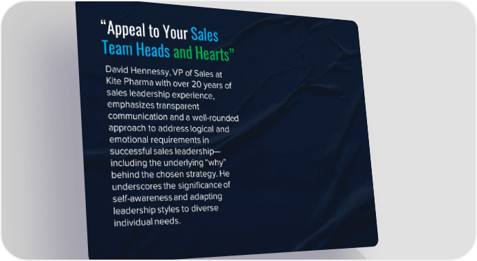 “Appeal to Your Sales Team Heads and Hearts” David Hennessy, VP of Sales at Kite Pharma with over 20 years of sales leadership experience, emphasizes transparent communication and a well-rounded approach to address logical and emotional requirements in successful sales leadership— including the underlying “why” behind the chosen strategy. He underscores the significance of self-awareness and adapting leadership styles to diverse individual needs.