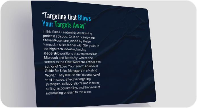 “Targeting that Blows Your Targets Away” In this Sales Leadership Awakening podcast episode, Colleen Stanley and Steven Rosen are joined by Helen Fanucci, a sales leader with 25+ years in the high-tech industry, holding leadership positions at companies like Microsoft and MediaFly, where she served as the Chief Revenue Officer and author of “Love Your Team: A Survival Guide for Sales Managers in a Hybrid World.” They discuss the importance of trust in sales, effective targeting strategies, collaboration's role in team selling, accountability, and the value of introducing oneself to the team.