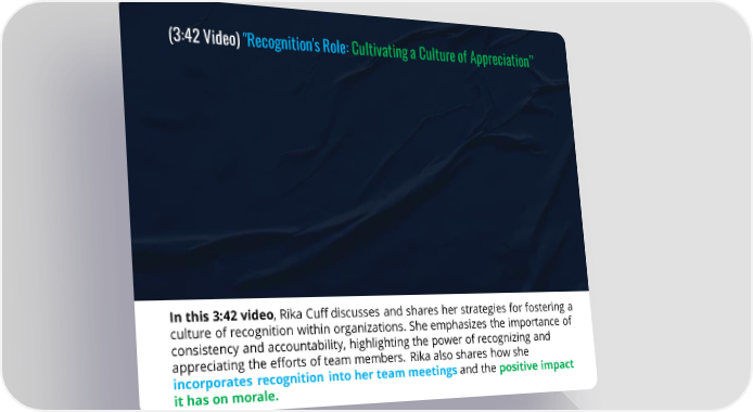 (3:42 Video) "Recognition's Role: Cultivating a Culture of Appreciation” In this 3:42 video, Rika Cuff discusses and shares her strategies for fostering a culture of recognition within organizations. She emphasizes the importance of consistency and accountability, highlighting the power of recognizing and appreciating the efforts of team members. Rika also shares how she incorporates recognition into her team meetings and the positive impact it has on morale.