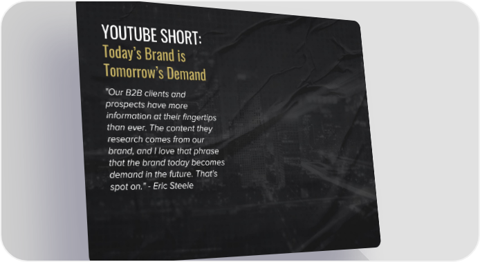 YOUTUBE SHORT: Today’s Brand is Tomorrow’s Demand "Our B2B clients and prospects have more information at their fingertips than ever. The content they research comes from our brand, and I love that phrase that the brand today becomes demand in the future. That's spot on." - Eric Steele