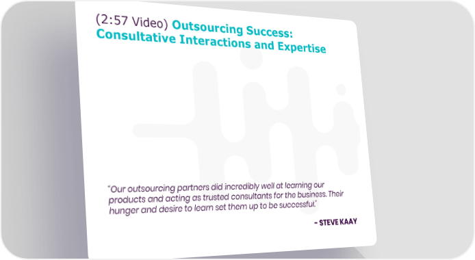 (2:57 Video) Outsourcing Success: Consultative Interactions and Expertise “Our outsourcing partners did incredibly well at learning our products and acting as trusted consultants for the business. Their hunger and desire to learn set them up to be successful.” -STEVE KAAY