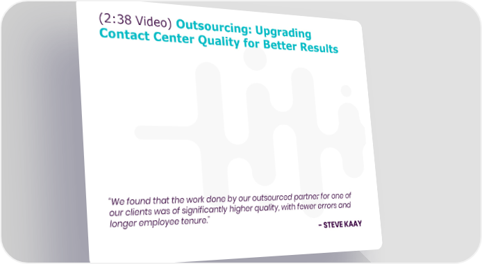 (2:38 Video) Outsourcing: Upgrading Contact Center Quality for Better Results “We found that the work done by our outsourced partner for one of our clients was of significantly higher quality, with fewer errors and longer employee tenure.” -STEVE KAAY