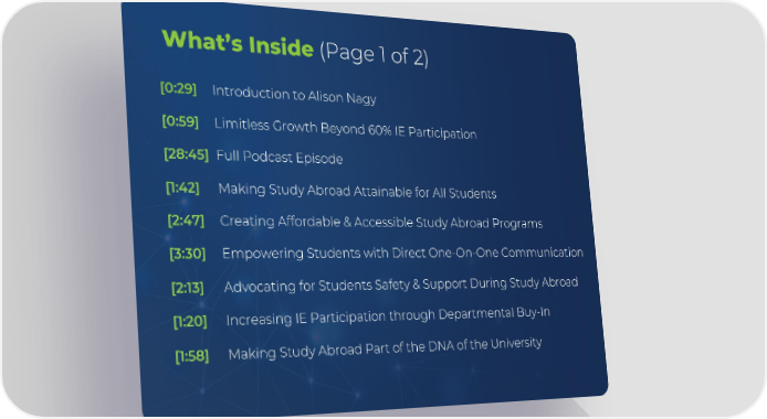 What’s Inside(Page 1 of 2) [0:29] Introduction to Alison Nagy [0:59] Limitless Growth Beyond 60% IE Participation [28:45] Full Podcast Episode [1:42] Making Study Abroad Attainable for All Students [2:47] Creating Affordable & Accessible Study Abroad Programs [3:30] Empowering Students with Direct One-On-One Communication [2:13] Advocating for Students Safety & Support During Study Abroad [1:20] Increasing IE Participation through Departmental Buy-In [1:58] Making Study Abroad Part of the DNA of the University