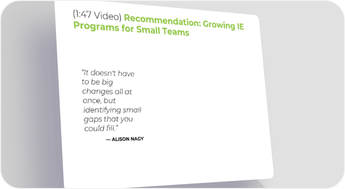 (1:47 Video) Recommendation: Growing IE Programs for Small Teams “It doesn't have to be big changes all at once, but identifying small gaps that you could fill.” —ALISON NAGY