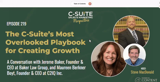 The C-Suite’s Most Overlooked Playbook for Creating Growth A Conversation with Jereme Baker, Founder & CEO at Baker Law Group, and Maureen Berkner Boyt, Founder & CEO at C2IQ Inc. EPISODE 219 Steve MacDonald HOST:
