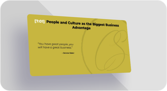 [7:01] People and Culture as the Biggest Business Advantage “You have great people, you will have a great business.” – Jereme Baker
