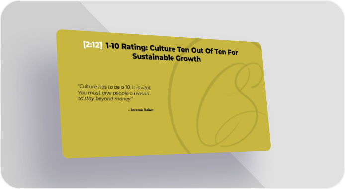 [2:12] 1-10 Rating: Culture Ten Out Of Ten For Sustainable Growth “Culture has to be a 10. It is vital. You must give people a reason to stay beyond money.” – Jereme Baker