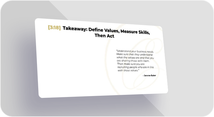 [3:18] Takeaway: Define Values, Measure Skills, Then Act “Understand your business needs. Make sure that they understand what the values are and that you are sharing those with them. Then make sure you are recruiting people who are in line with those values.” – Jereme Baker