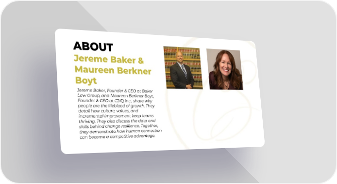 ABOUT Jereme Baker & Maureen Berkner Boyt Jereme Baker, Founder & CEO at Baker Law Group, and Maureen Berkner Boyt, Founder & CEO at C2IQ Inc., share why people are the lifeblood of growth. They detail how culture, values, and incremental improvement keep teams thriving. They also discuss the data and skills behind change resilience. Together, they demonstrate how human connection can become a competitive advantage.