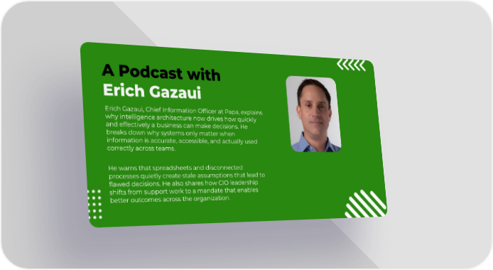 EPISODE: A Podcast with Erich Gazaui Erich Gazaui, Chief Information Officer at Papa, explains why intelligence architecture now drives how quickly and effectively a business can make decisions. He breaks down why systems only matter when information is accurate, accessible, and actually used correctly across teams. He warns that spreadsheets and disconnected processes quietly create stale assumptions that lead to flawed decisions. He also shares how CIO leadership shifts from support work to a mandate that enables better outcomes across the organization.