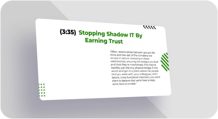 (3:35) Stopping Shadow IT By Earning Trust “Often, relationships between groups like mine and the rest of the company are service in nature. Investing in those relationships, ensuring the bridges are built and that they're maintained, that they're healthy, just like any physical bridge in the world, and get to a place where the people that you work with, your colleagues, other teams, cross-functional members, you want them to believe that we're here to help, we're here to enable.”