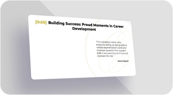 [0:56] Building Success: Proud Moments in Career Development "Iām a problem solver who enjoys building, so being able to create segmentation tools and manage systems that support B2B is very exciting and a proud moment for me." ā Joanna Nguyen