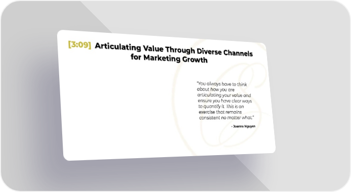 [3:09] Articulating Value Through Diverse Channels for Marketing Growth “You always have to think about how you are articulating your value and ensure you have clear ways to quantify it. This is an exercise that remains consistent no matter what.” – Joanna Nguyen
