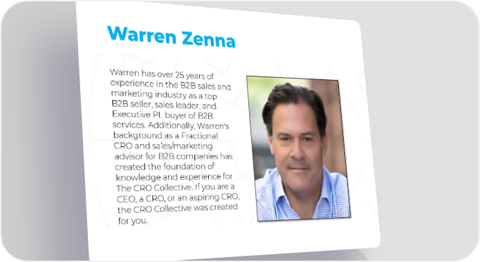 Warren Zenna Warren has over 25 years of experience in the B2B sales and marketing industry as a top B2B seller, sales leader, and Executive PL buyer of B2B services. Additionally, Warren's background as a Fractional CRO and sales/marketing advisor for B2B companies has created the foundation of knowledge and experience for The CRO Collective. If you are a CEO, a CRO, or an aspiring CRO, the CRO Collective was created for you.