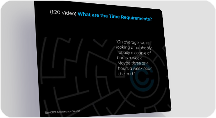 (1:20 Video) What are the Time Requirements? “On average, we’re looking at probably initially a couple of hours a week. Maybe three or 4 hours a week near the end.” The CRO Accelerator Course The CRO Collective: Re-Defining and Developing Chief Revenue Officers Page 14 Page 16Video Player is loading.Play VideoPlaySkip BackwardSkip ForwardMuteCurrent Time 0:00/Duration 1:21Loaded: 0.00%0:00Stream Type LIVESeek to live, currently behind liveLIVERemaining Time -1:21 1xPlayback RateChaptersChaptersDescriptionsdescriptions off, selectedCaptionscaptions settings, opens captions settings dialogcaptions off, selectedAudio TrackPicture-in-PictureFullscreenThis is a modal window.Beginning of dialog window. Escape will cancel and close the window.TextColorWhiteBlackRedGreenBlueYellowMagentaCyanOpacityOpaqueSemi-TransparentText BackgroundColorBlackWhiteRedGreenBlueYellowMagentaCyanOpacityOpaqueSemi-TransparentTransparentCaption Area BackgroundColorBlackWhiteRedGreenBlueYellowMagentaCyanOpacityTransparentSemi-TransparentOpaqueFont Size50%75%100%125%150%175%200%300%400%Text Edge StyleNoneRaisedDepressedUniformDrop shadowFont FamilyProportional Sans-SerifMonospace Sans-SerifProportional SerifMonospace SerifCasualScriptSmall CapsResetDoneClose Modal DialogEnd of dialog window.video