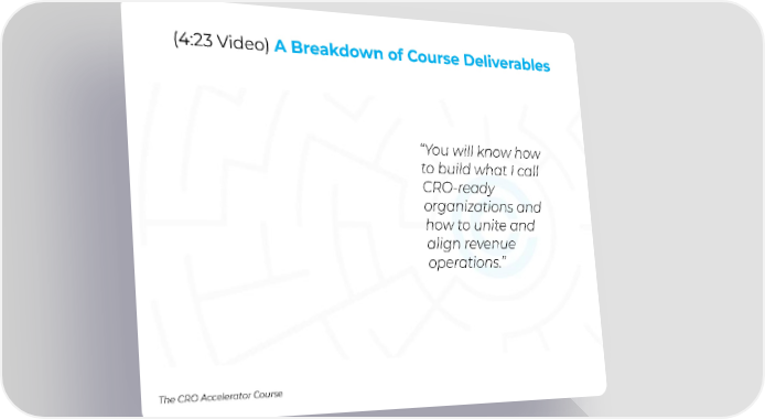 (4:23 Video) A Breakdown of Course Deliverables “You will know how to build what I call CRO-ready organizations and how to unite and align revenue operations.” The CRO Accelerator Course The CRO Collective: Re-Defining and Developing Chief Revenue Officers Page 12 Page 14Video Player is loading.Play VideoPlaySkip BackwardSkip ForwardMuteCurrent Time 0:00/Duration 4:24Loaded: 0.00%0:00Stream Type LIVESeek to live, currently behind liveLIVERemaining Time -4:24 1xPlayback RateChaptersChaptersDescriptionsdescriptions off, selectedCaptionscaptions settings, opens captions settings dialogcaptions off, selectedAudio TrackPicture-in-PictureFullscreenThis is a modal window.Beginning of dialog window. Escape will cancel and close the window.TextColorWhiteBlackRedGreenBlueYellowMagentaCyanOpacityOpaqueSemi-TransparentText BackgroundColorBlackWhiteRedGreenBlueYellowMagentaCyanOpacityOpaqueSemi-TransparentTransparentCaption Area BackgroundColorBlackWhiteRedGreenBlueYellowMagentaCyanOpacityTransparentSemi-TransparentOpaqueFont Size50%75%100%125%150%175%200%300%400%Text Edge StyleNoneRaisedDepressedUniformDrop shadowFont FamilyProportional Sans-SerifMonospace Sans-SerifProportional SerifMonospace SerifCasualScriptSmall CapsResetDoneClose Modal DialogEnd of dialog window.video