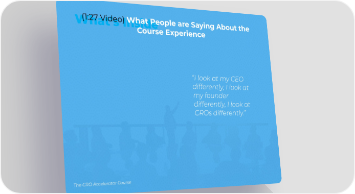 (1:27 Video) What People are Saying About the What’s Inside Course Experience “I look at my CEO differently, I look at my founder differently, I look at CROs differently.” The CRO Accelerator Course The CRO Collective: Re-Defining and Developing Chief Revenue Officers Page 13 Page 15Video Player is loading.Play VideoPlaySkip BackwardSkip ForwardMuteCurrent Time 0:00/Duration 1:28Loaded: 0.00%0:00Stream Type LIVESeek to live, currently behind liveLIVERemaining Time -1:28 1xPlayback RateChaptersChaptersDescriptionsdescriptions off, selectedCaptionscaptions settings, opens captions settings dialogcaptions off, selectedAudio TrackPicture-in-PictureFullscreenThis is a modal window.Beginning of dialog window. Escape will cancel and close the window.TextColorWhiteBlackRedGreenBlueYellowMagentaCyanOpacityOpaqueSemi-TransparentText BackgroundColorBlackWhiteRedGreenBlueYellowMagentaCyanOpacityOpaqueSemi-TransparentTransparentCaption Area BackgroundColorBlackWhiteRedGreenBlueYellowMagentaCyanOpacityTransparentSemi-TransparentOpaqueFont Size50%75%100%125%150%175%200%300%400%Text Edge StyleNoneRaisedDepressedUniformDrop shadowFont FamilyProportional Sans-SerifMonospace Sans-SerifProportional SerifMonospace SerifCasualScriptSmall CapsResetDoneClose Modal DialogEnd of dialog window.video