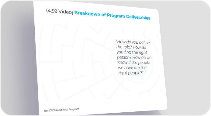 (4:59 Video) Breakdown of Program Deliverables “How do you define the role? How do you find the right person? How do we know if the people we have are the right people?” The CRO Readiness Program