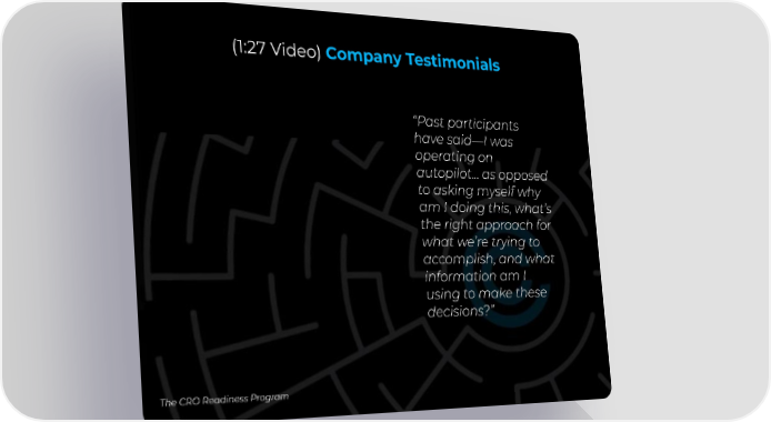 (1:27 Video) Company Testimonials “Past participants have said—I was operating on autopilot… as opposed to asking myself why am I doing this, what’s the right approach for what we’re trying to accomplish, and what information am I using to make these decisions?” The CRO Readiness Program