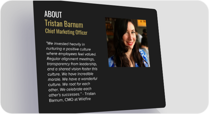 ABOUT Tristan Barnum Chief Marketing Officer "We invested heavily in nurturing a positive culture where employees feel valued. Regular alignment meetings, transparency from leadership, and a shared vision foster this culture. We have incredible morale. We have a wonderful culture. We root for each other. We celebrate each other's successes.” - Tristan Barnum, CMO at Wildfire